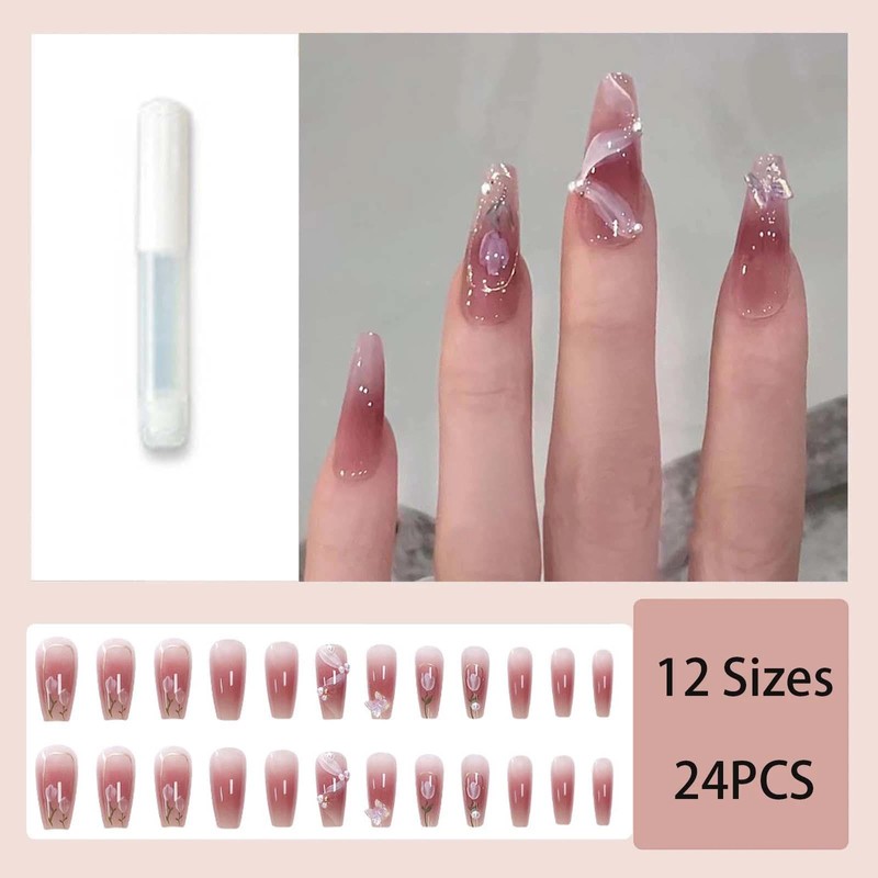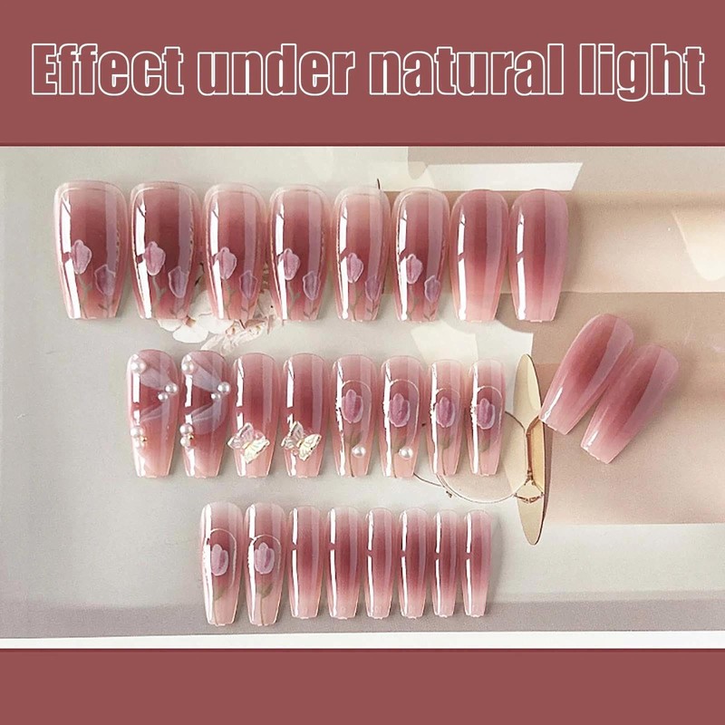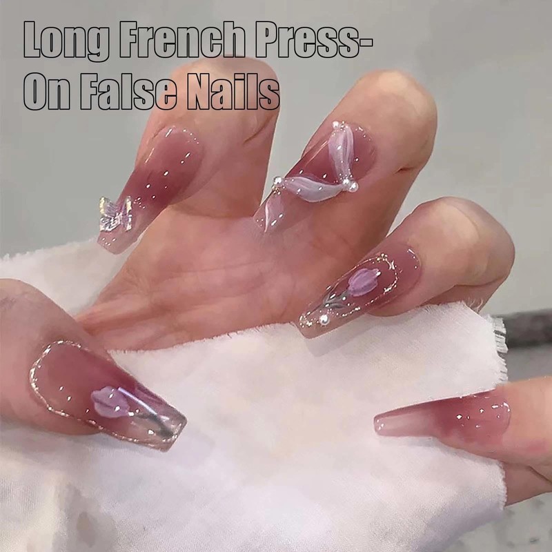 - French design: These elegant fake nails are designed with tulip pearl ribbon, 3D pearls and shiny butterflies to provide an elegant look for everyday life or work. They are perfect for DIY and last-minute appointments