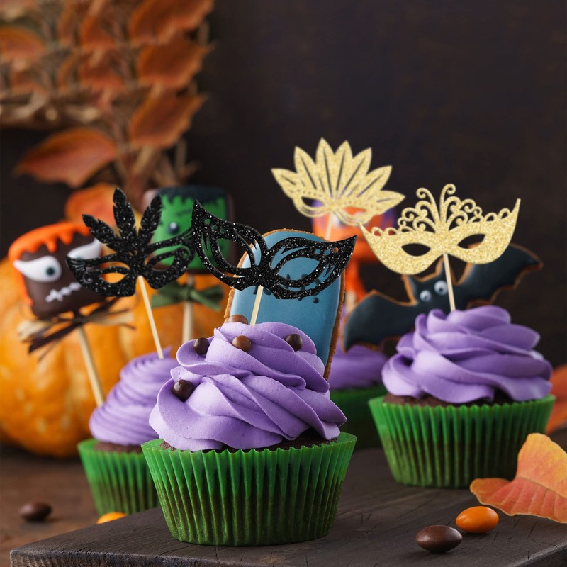 24Pcs Masquerade Masks Cupcake Toppers Black Gold Glitter Bachelorette Party Mask Cupcake Food Picks Masquerade Mardi Gras Party Baby Shower Birthday Party Supplies