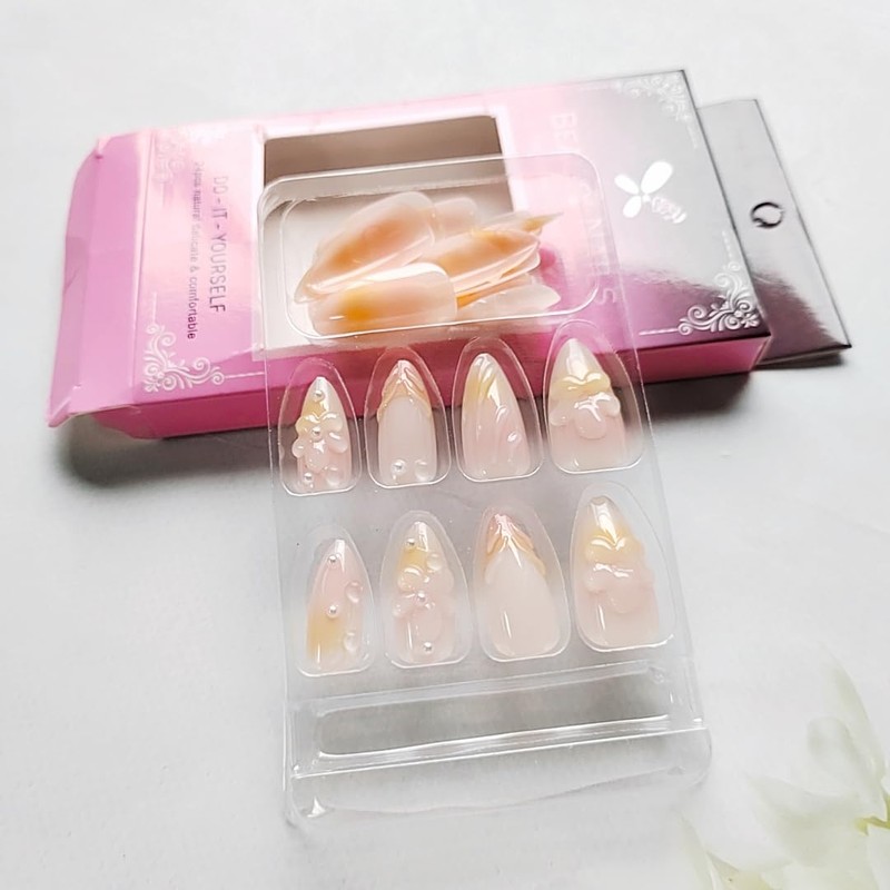 - Experience the convenience of instant manicures with our medium almond shaped press on nails kit. Achieve a salon-quality look at home with these 24 pcs glossy reusable fake nails. Simply press on for a flawless finish in minutes