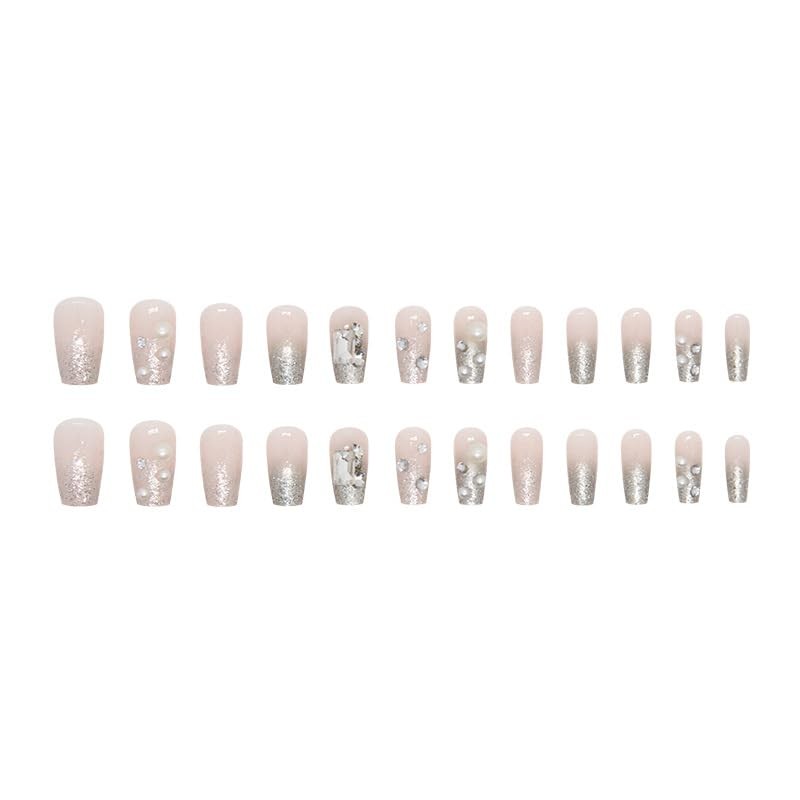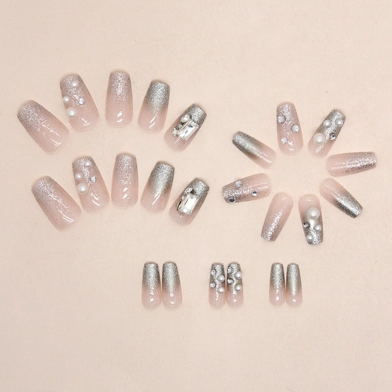 24PCS Medium Coffin Press on Nails, Short Pink Rhinestone Glue on Nails, with Silver Glitter Design False Nails, Reusable on Nails Press On Nails Kit for Women Stick on Nails Finger Manicur