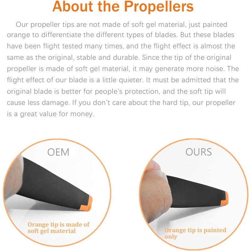 - 【Upgraded Version】Our Mini 3 propeller tips are not made of soft gel material, just painted orange to differentiate the different types of blades. But these blades have been flight tested many times, and the flight effect is almost the same as the original, stable and durable.