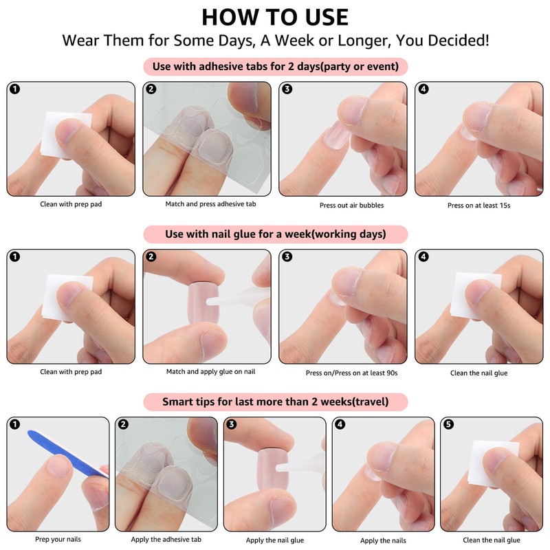 - Easy and Well Fitting: Beautiful Nails in Minutes! Polish and clean the nail surface, choose the proper press on false nails to paste on our natural nails, press for 30 seconds to create a fashionable manicure. Easy to apply, no need to spend hours at the nail salon for expensive manicures. You can change your nail style anytime and anywhere, just choose the right size and use nail glue or jelly glue. Great choice for home DIY manicures and urgent appointments
