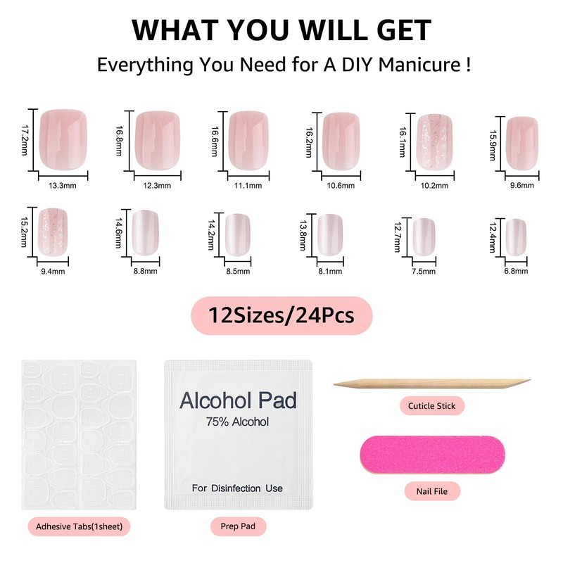- What You Will Get: You will get 24pcs nude pink shimmer press on nails a set of DIY nail art tools. There are 12 different sizes of fake nails, you can choose the right size of fake nails to stick on your nails and get salon-like beautiful nails easily. Whether for a relaxed weekend or significant social event, our nails meet your needs, showcasing your unique charm and exuding confidence and fashion sense in any situation