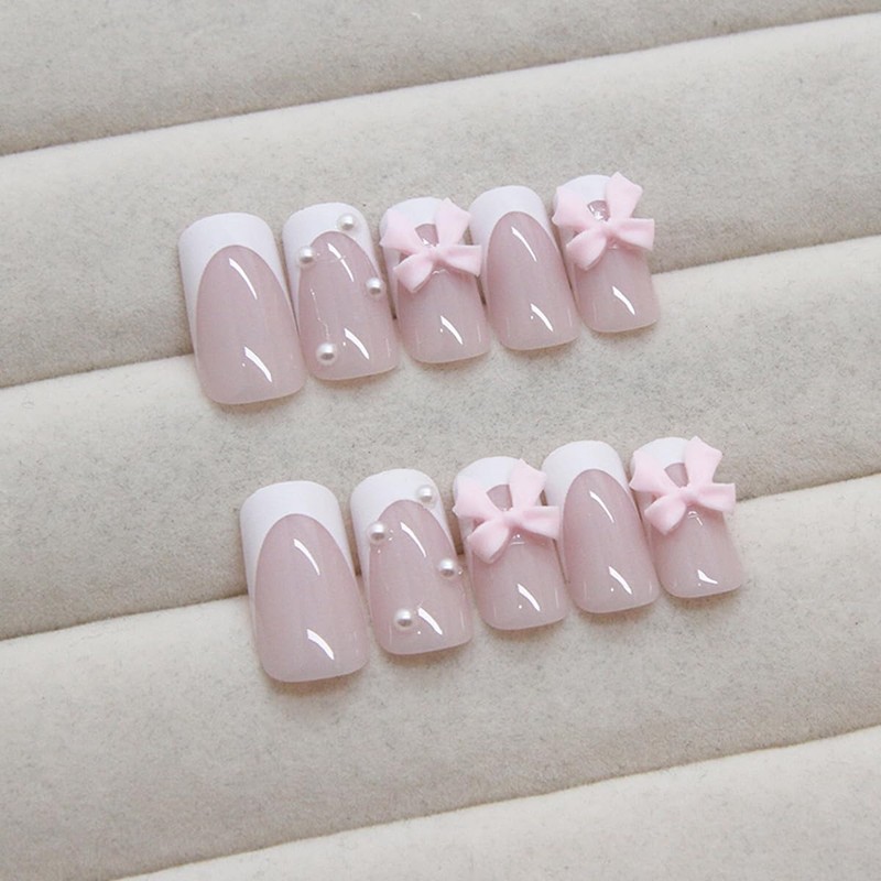 24Pcs Pink Press on Nails Medium Square White French Fake Nails Press ons Nail Art Tip 3D Bow Pearl Rhinestone Design Glue on Nails Artificial Acrylic Nails Full Cover False Nail for Women Nail Decor