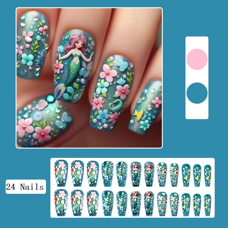 24Pcs Press on Nails Fish Gel on Nail Sweet Cool Flower False Nails Sea Press on Nails Set Acrylic Press on Nails Flower Summer Flower Press on Nails with Floral Designs Stick on Nails