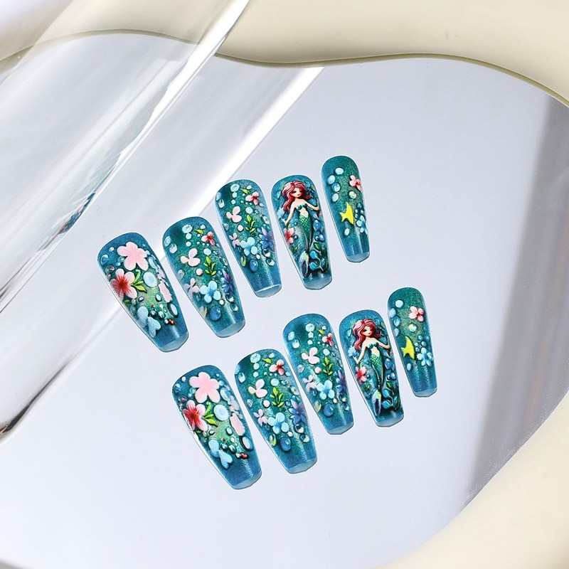 24Pcs Press on Nails Fish Gel on Nail Sweet Cool Flower False Nails Sea Press on Nails Set Acrylic Press on Nails Flower Summer Flower Press on Nails with Floral Designs Stick on Nails