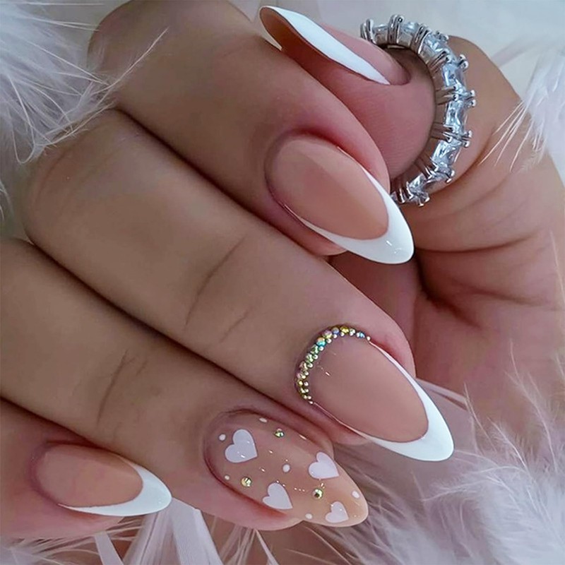 24PCS Press on Nails, French False Nails - Medium Long Almond False Nails - Full coverage Glossy False Nails with Glue - Stick on Nails for Women Girls Valentine's day (Nude White Heart Diamond)
