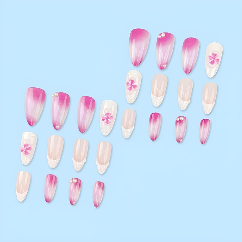 - Package Includes: 24 pcs stick on false glue on nails kit, each box includes 24 medium almond press on nails, 1 sheet of 24 sticky nail pieces, 1 cuticle stick, 1 double sided nail file.All the tools you need to apply the nails are included in one set.