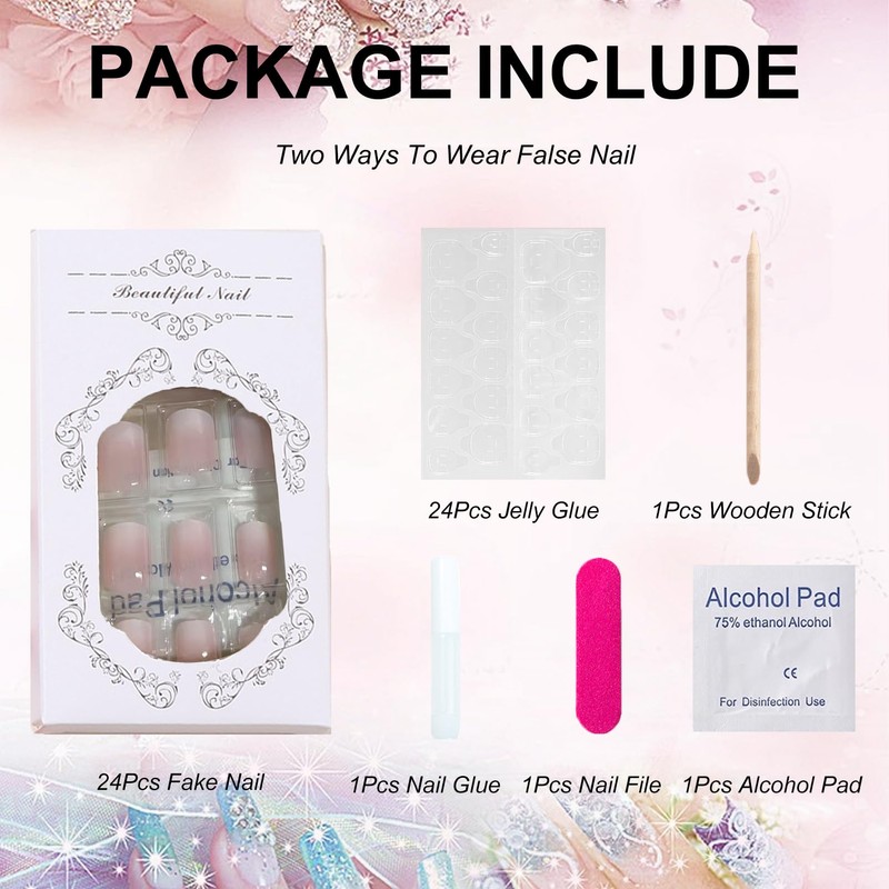 - 【STICK ON NAILS KIT】You will get 24Pcs french false nails, 1 nail glue, 1 sheet self ahesive jelly glue (24Pcs), 1 nail files, 1 clean pad and 1 wooden sticks, various nail tools that easy to do your nails. You can choose to stick with jelly glue or glue to create a beautiful french nail art for special occasions or every day!