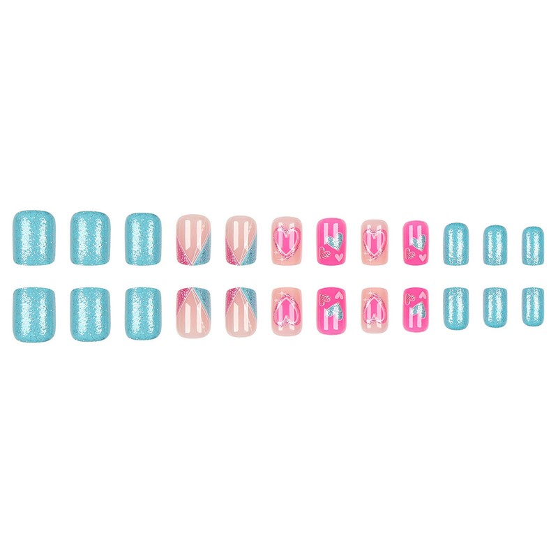 24Pcs Press on Nails Short Square Pink & Blue Fake Nails Glitter Full Cover Nails Press Ons with Cute Heart Design Acrylic False Nails Glossy Stick on Nails for Women Artificial Nails Kit