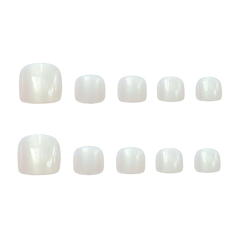 - package:Our packaging includes 24 light white fake toenails, a nail file, a small wooden stick, an alcohol strip, and 24 jelly glue gels.