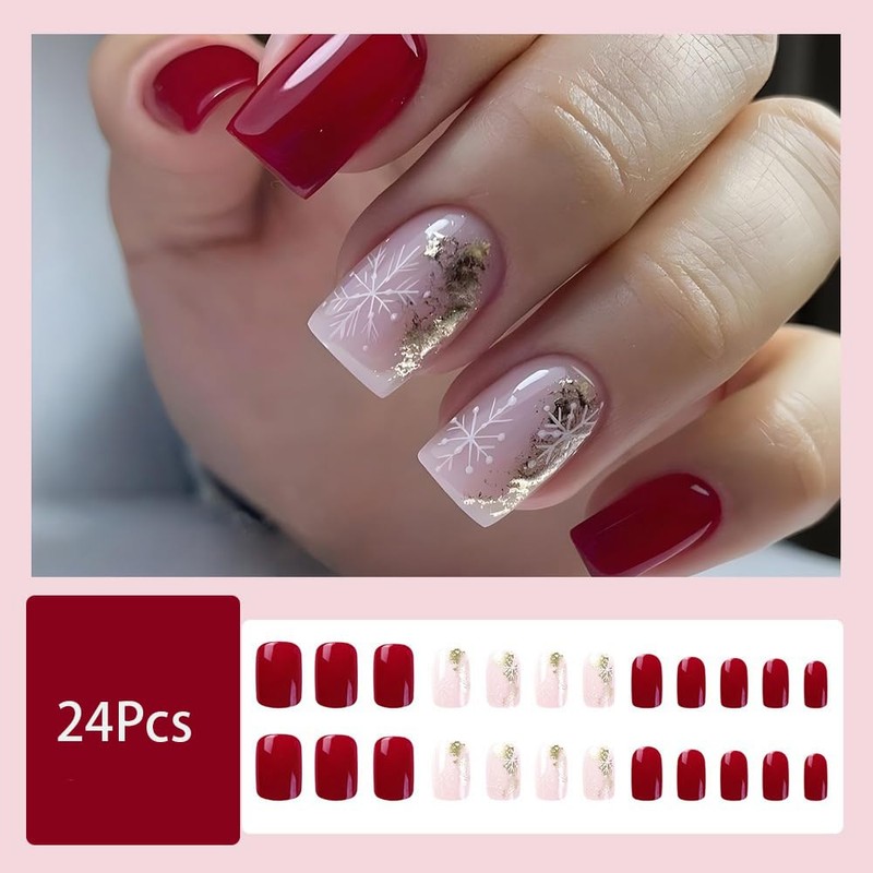 24Pcs Red Press on Nails Christmas Fake Nails Snowflake with Gold Foil Design Short Square False Nails Artificial Nails Glossy Glue on Nails Stick on Nails for Women Manicure Decorations