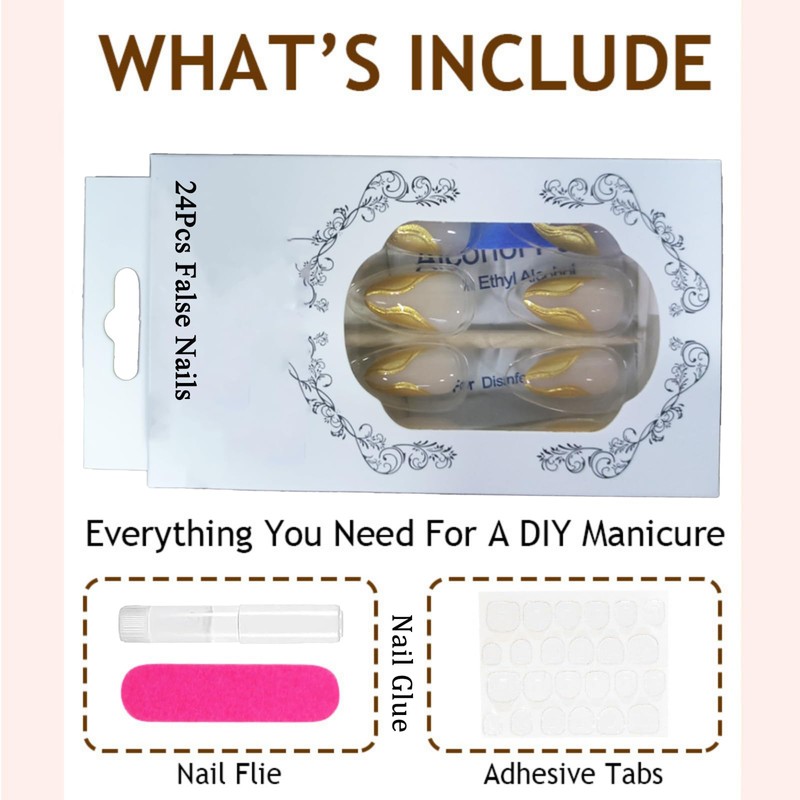 24pcs Short False Nails - Almond Press on Nails in 12 Sizes - Full Cover Acrylic Press on Nails with Gold Dust Design - Removable Fake nails Women Girls Nail Art Accessories