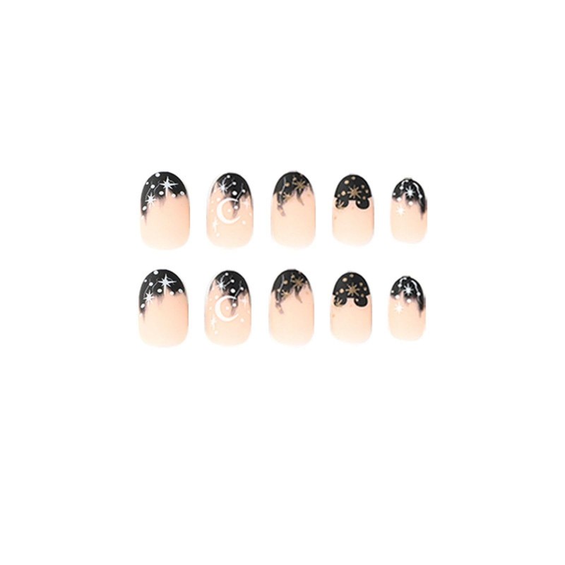 24pcs Short Oval False Nails French Tip Stick on Nails Matte Black Edge Press on Nails White Moon Gold Star Removable Glue-on Nails Acrylic Full Cover Fake Nails Set Women Nail Art Accessories