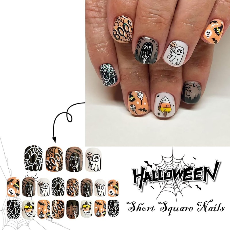 24Pcs Short Press on Nails Cute Halloween Fake Nails Ghost Spider Web Bat Pattern Short Square Acrylic False Nails Glossy Full Cover Artificial Stick on Nails Halloween Party Nail Decoration for Women