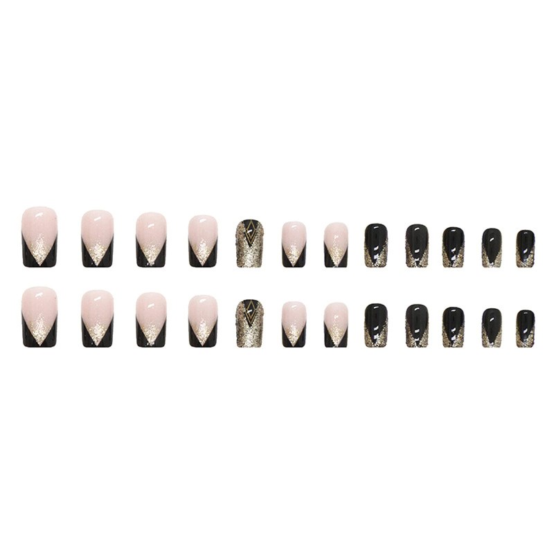 24pcs Short Square False Nails French Tip Stick on Nails Black Press on Nails with Gold Sequins, Removable Glue-on Nails Fake Nails Women Girls Nail Art Accessories
