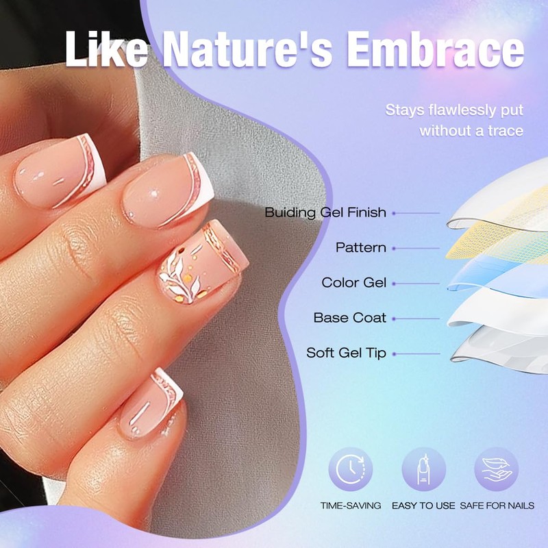 These wear-on fake nails radiate a refined yet fresh vibe. Whether you’re attending a wedding, prepping for a cocktail party, heading to the office, or enjoying a brunch with friends, this set adds a clean, stylish, and captivating touch. The white French nails with gold trim offer a timeless classic look, while the leaf-accented designs bring a natural, chic flair.