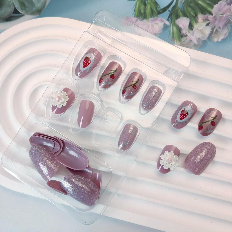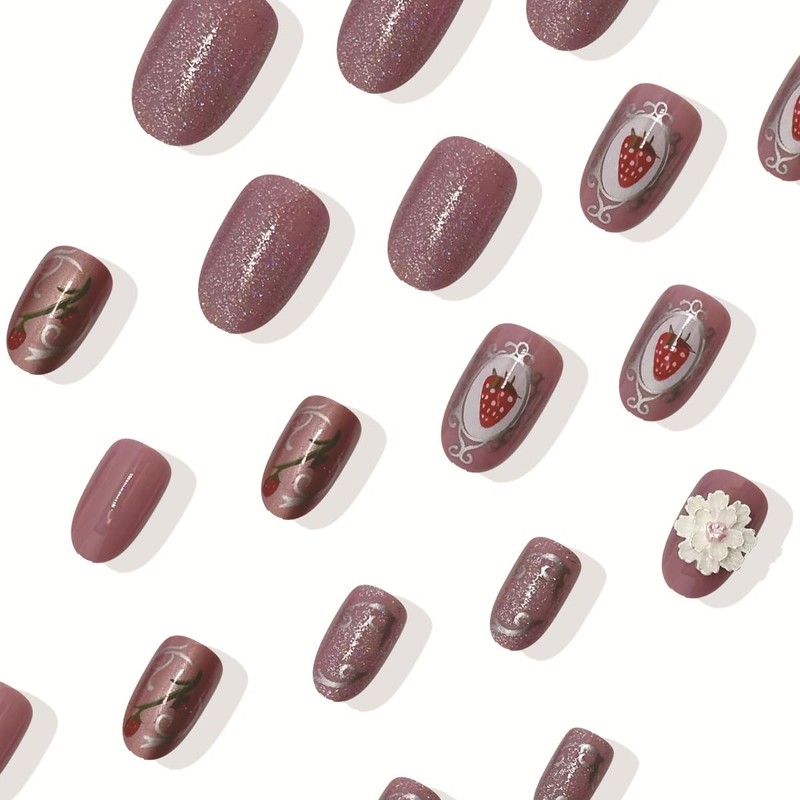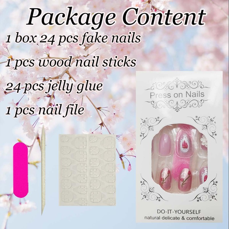 Quantity: 24Pcs strawberry cute fake nails set 12 different sizes, that fits your every finger