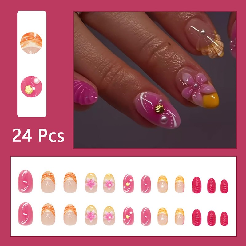 24Pcs Summer Press on Nails Short Almond Fake Nails with Pearl Designs 3D Seashell Stick on Nails Pink Flower Acrylic Nails Summer Beach False Nails Full Cover French Tip Glue on Nails for Women