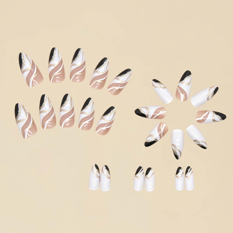 24Pcs Tip Press On Nails Black White Press On Nails Almond Long Fake Nails Golden Stripes with Nail Glue Fit Perfectly Acrylic Reusable Stick on Nails in 12 Sizes for Women Girls