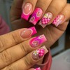 24Pcs Valentine's Day Press on Nails Square Pink French Fake Nails Medium with Gingham Pattern Heart Design Acrylic Nails Holiday False Nails Coffin Nails Full Cover Flower Stick on Nails for Women