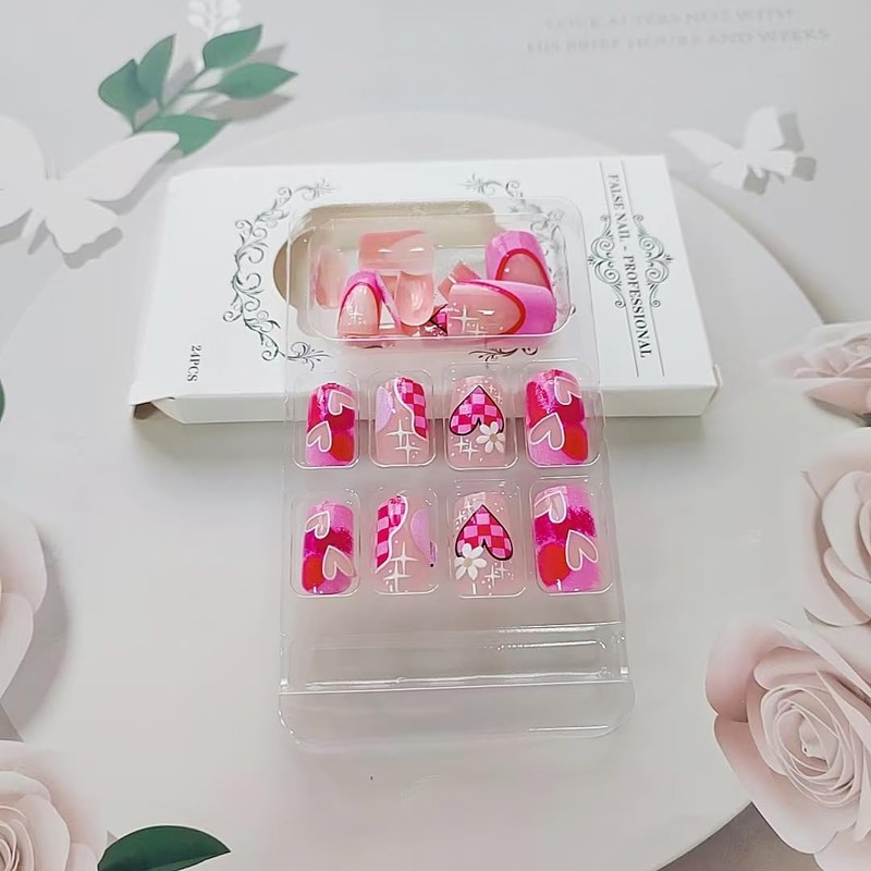 - Valentine's Day Nails Stick on Nails Package:You'll get 24 pieces love heart false nails. 1 mini nail file, 1 small wooden stick, 1 piece of nail glue sticker. Nail glue sticker are perfect for most people's nails