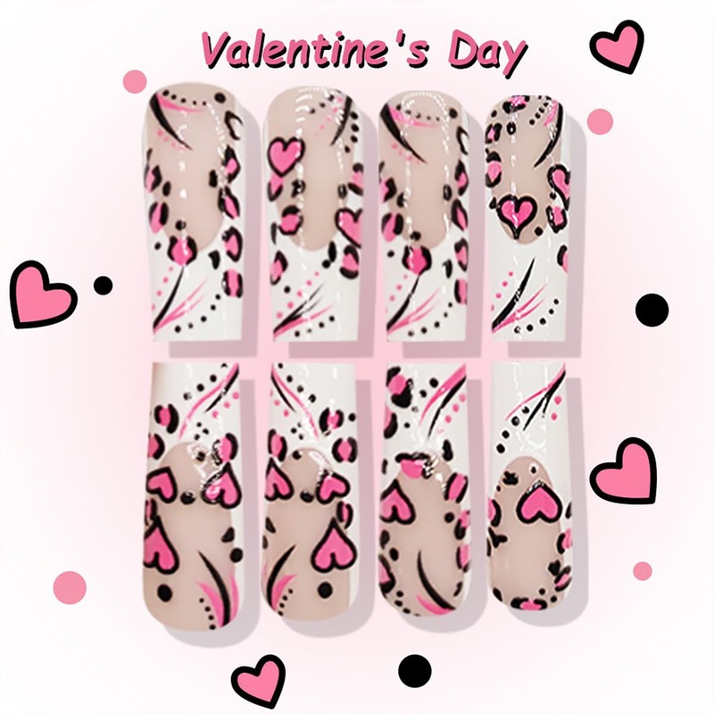 - Valentines False Nails: Made with quality materials, our set of 24 long coffin fake nails feature a trendy pink heart acrylic design in glossy,give 24 pcs jelly gel 1 wooden stick 1 nail file perfect for manicure decoration