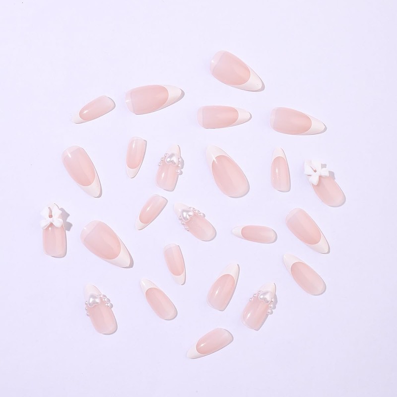 24Pcs White French Tip Press on Nails Medium Almond Fake Nails with Glitter Heart Nail Charms Acrylic Nails Cute Pearls Bow Full Cover False Nails Nude Pink Glue on Nails for Women DIY Stick on Nails