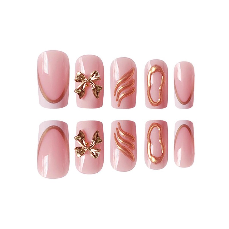 24pcs White French Tip Press on Nails Short Square False Nails Pink Full Cover Fake Nails with Gold Bow Charm Design Acrylic Nails Press ons Glossy Reusable Stick on Nails Women