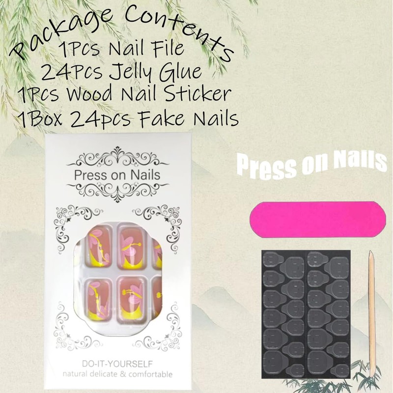 - Package Contents:24Pcs square press on nails medium +1 Nail File + 24Pcs Jelly Glue Stickers+1 alcohol cotton+1 wooden stick.(Durability of jelly glue is not as good as liquid glue, but it makes fake nails reusable. Please use suitable glue according to different scenes)