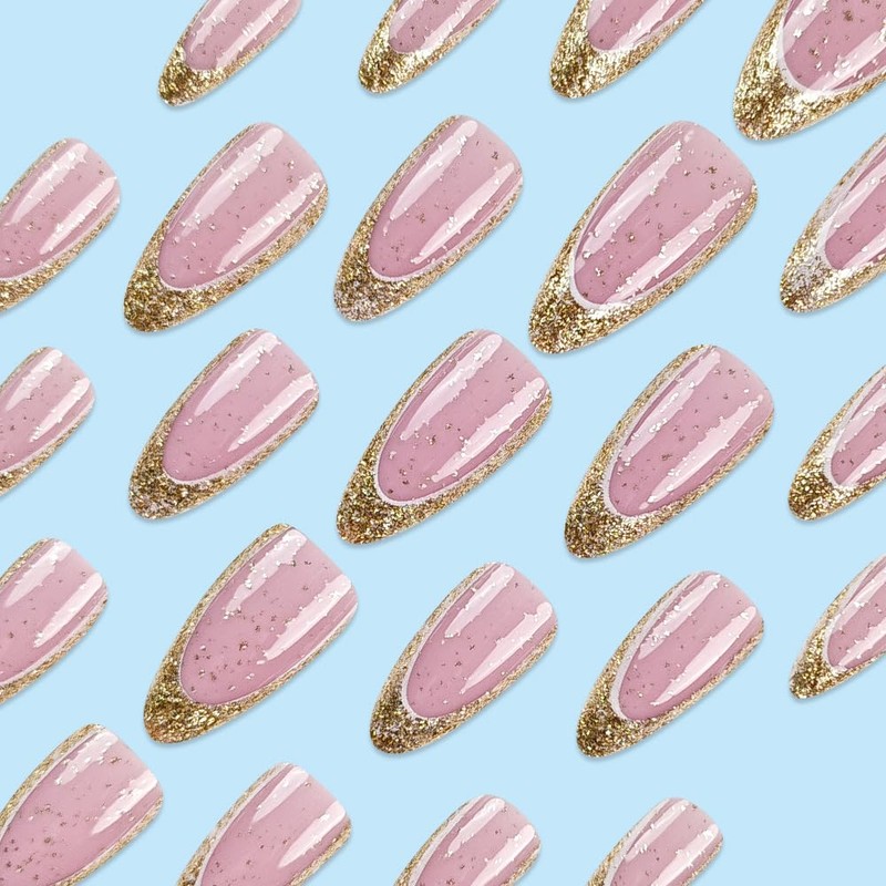 24STK French Press on Nails Mittellange Almond Künstliche Nägel Glitzer Gold Rand Fingernägel zum Aufkleben Rosa Klebe Nägel Set Acrylnagelspitzen Accessories für Damen