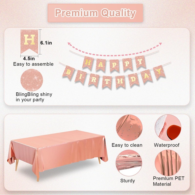 • Rose Gold Birthday Décor: Beautiful attractive fringe curtains, hanging swirls and balloons arch are easy to create a warm and happy atmosphere; wearing the gold stamp sash, you will become the party highlight, just enjoy it