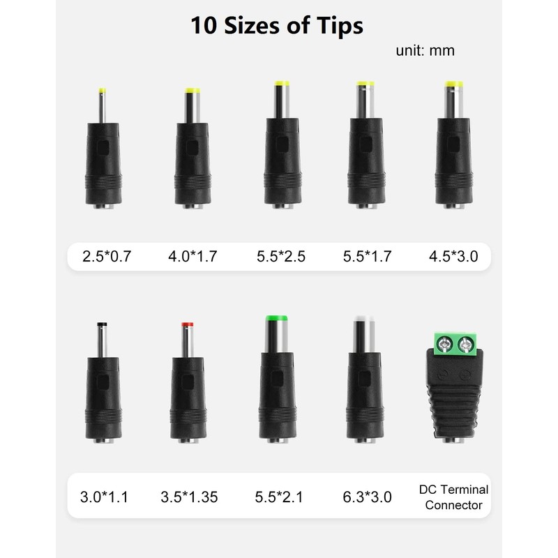 10 more Sizes of Tips: 2.5mm x 0.7mm, 4.0mm x 1.7mm, 5.5mm x 2.5mm, 5.5mm x 1.7mm, 4.5mm x 3.0mm, 3.0mm x 1.1mm, 3.5mm x 1.35mm, 5.5mm x 2.1mm, 6.3mm x 3.0mm, DC Terminal connector.