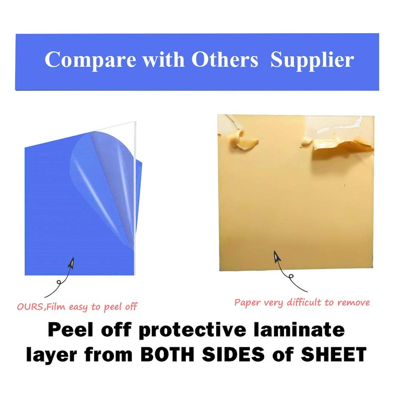 How to use? like laser engraving, uv printing,silk screen printing, cnc cuting, gluing, bending, fire polishing, diamond polishing,drilling and write with chalk marker etc Many Purpose? Like handcrafs, diy projects,home decoration,acrylic display, letter, signs, glass window replacement, poster picture frame replacement,art projects, shelving, case, screen protection,menu boards, marker boards,nameplate,floating photo frame,signage,tabletop protector,aquarium etc DYCacrlic Design acrylic has many benefiting characteristics like glossy surface, weather resistance, sturdy, durable, light weight, thermoplastic and innovative. Acrylic/plexiglass is lighter and stronger alternative to glass. It is easier to fabricate than glass. It is suitable for a wide range of products: picture frames, store displays, furniture, shelving, windows, barriers, shields, replacement glass and aquariums,signboards, lighting, aquarium, shades, furniture... FEATURES AND BENEFITS of Plexiglass Sheet - Acrylic - CAST Why use CAST Acrylic verses EXTRUDED Acrylic ? Continuous Service Temp: 180° F (Cast) vs. 160° F (Extruded) Formability Temp: 340° F to 380° F (Cast) vs 290° F to 320° F (Extruded) Cast acrylic has a higher molecular weight, therefore it will cut, drill and rout cleaner. When machining cast acrylic, shavings will flake off whereas extruded acrylic shavings may gum up on the tool. Cast acrylic also offers better glue-joint effectiveness and performs better in laser cutting. Our store also offer below dimension for you, you can check Size offered: 4x6",5x7",8x10",8.5x11",8x12",6x12",12x12",12x24",24x24"24x36" Thickness:1/16"(1.5mm),1/8"(3mm),3/16"(4.5mm),1/4"(6mm),3/8"(9mm)