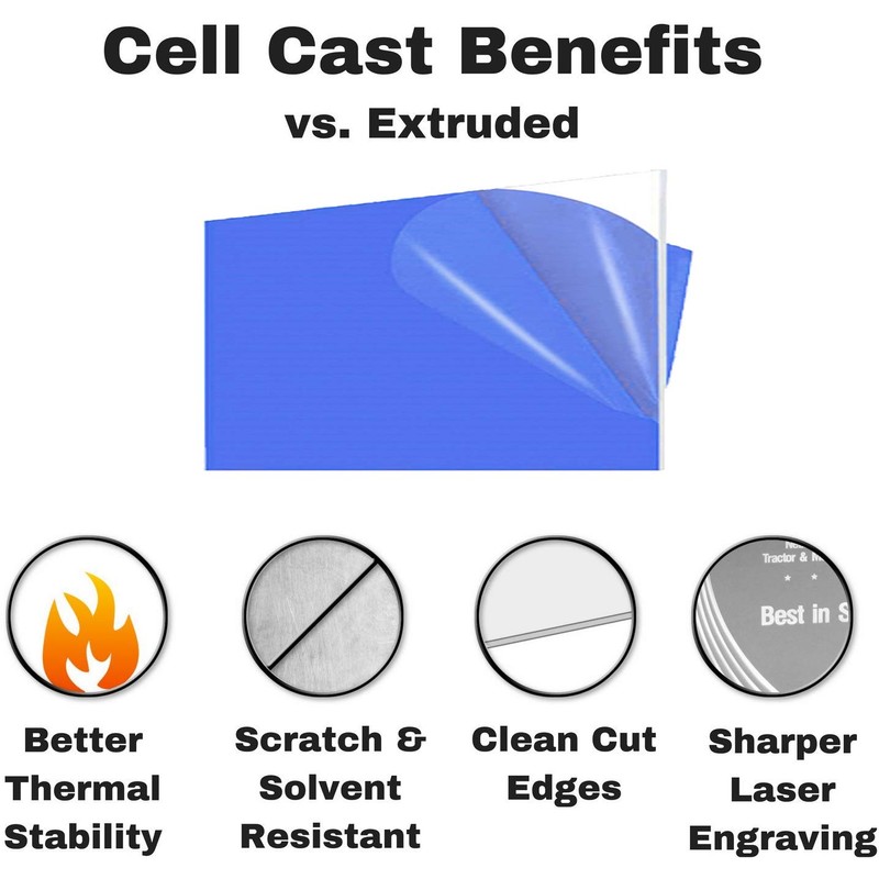 - Stronger - Lighter than Glass: half the weight and much stronger than glass. Offers better weather, UV resistance, more exceptional weatherability, strength, clarity and versatility. CELL CAST BENEFITS vs. extruded: More resistant to scratching and solvents, better optical properties; Outstanding resistance to long-term exposure to sunlight and weathering
