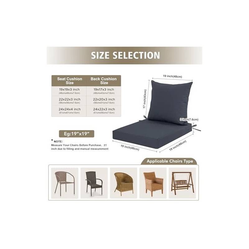 【Perfect Fit for Outdoor Furniture】 Available in sizes like 19x19 inches, 22x22 inches, and 24x24 inches, these cushions fit most outdoor chairs, sofas, and patio furniture. With adjustable tie-down straps, they stay securely in place, providing worry-free comfort.