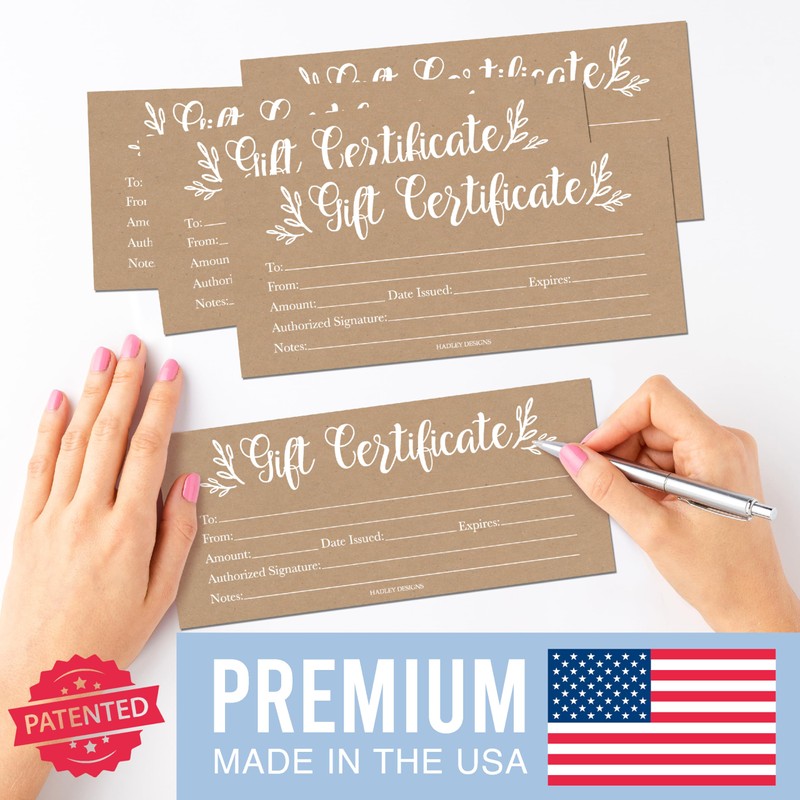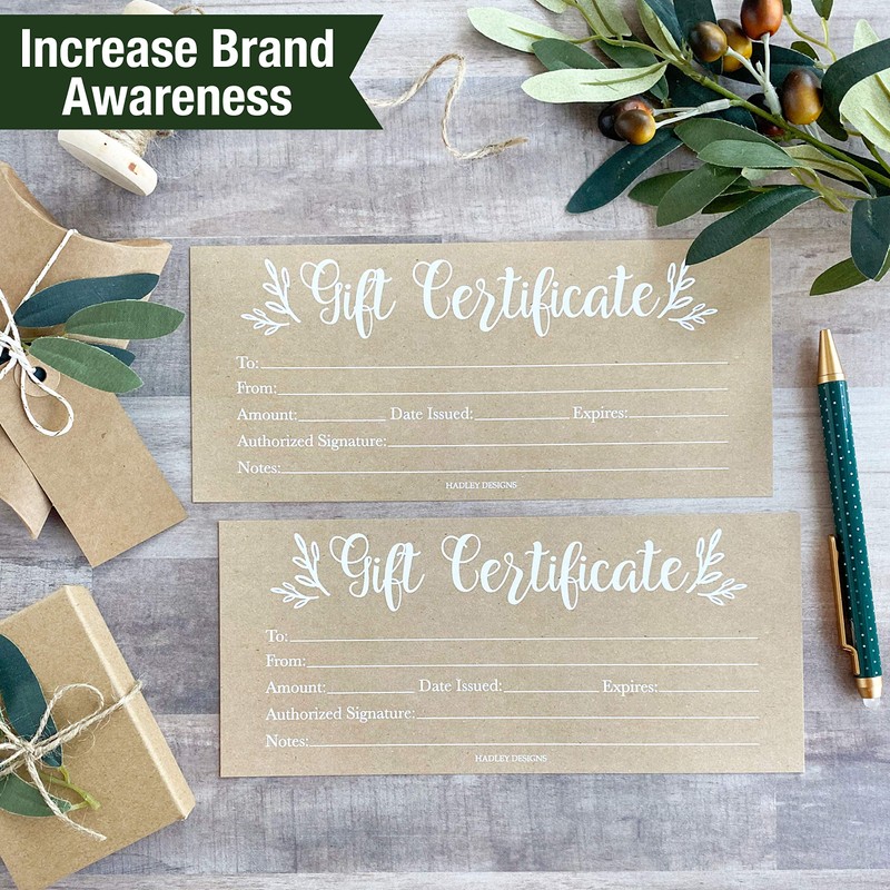 - Build Customer Loyalty and Establish Your Brand; Every major company offers gift cards and coupons, and, as a small business owner, you should too; Use these blank gift certificates for business, no matter what your business; With a rustic kraft brown and white design, they make unique hair salon and spa gift certificates, but they're also great for restaurants, boutiques, and more.
