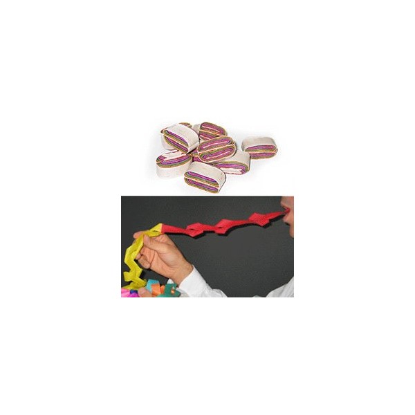 After eating a few pieces of coloured paper, the magician pulls out a 25-foot length of coloured paper!