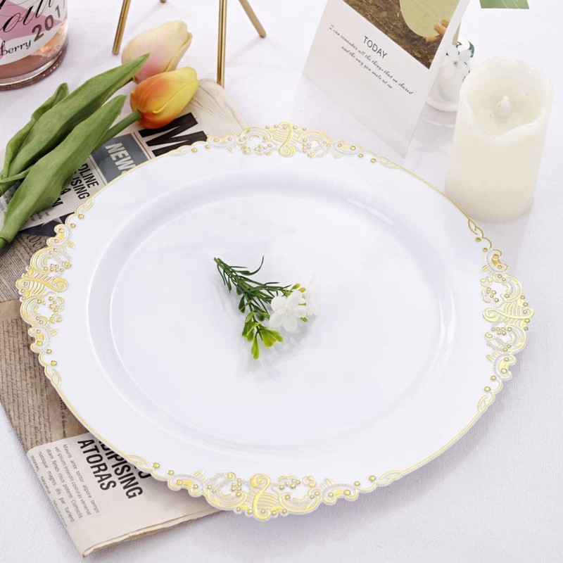 - Elevate the sophistication of your event with thesegold plastic plates featuring a stunning gold rim. These fancy reusable plates look remarkably realistic, enhancing any table with their elegant appearance.