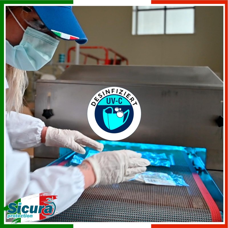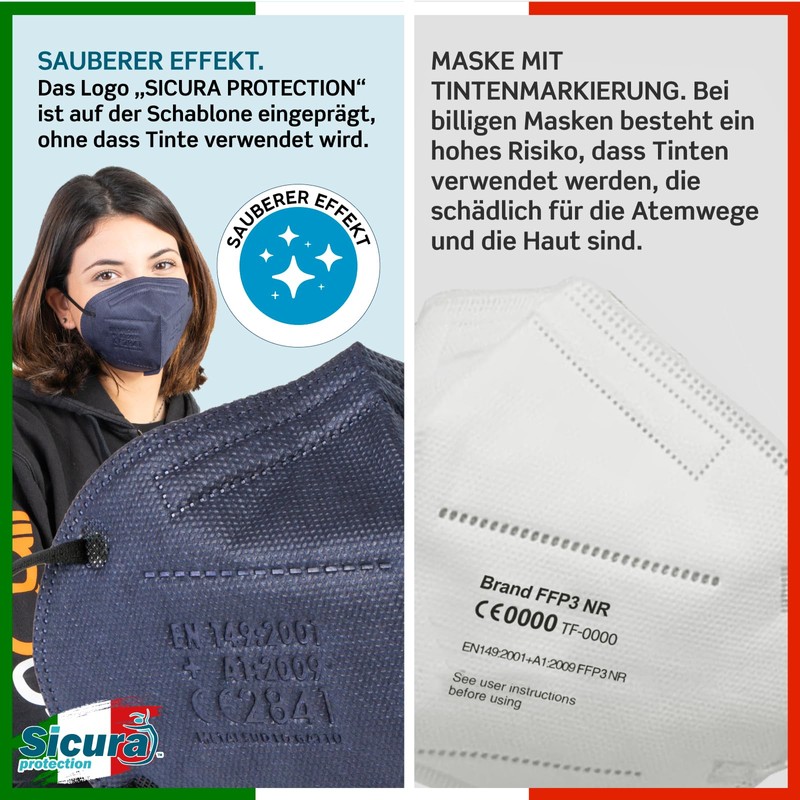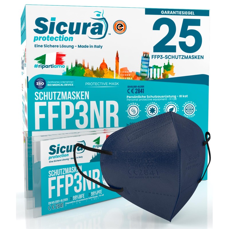 25 x CE Certified FFP3 Masks Blue with Black Rubber Bands Made in Italy with Printed Sicura Logo PFE ≥99% BFE ≥99% Sanified Individually Sealed