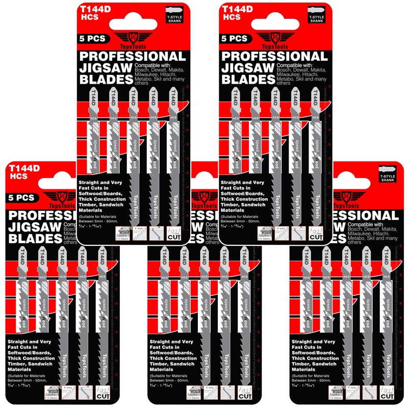 25 x TopsTools T144D Straight and Fast cuts Jigsaw Blades Compatible with Bosch, Dewalt, Makita, Milwaukee and many more