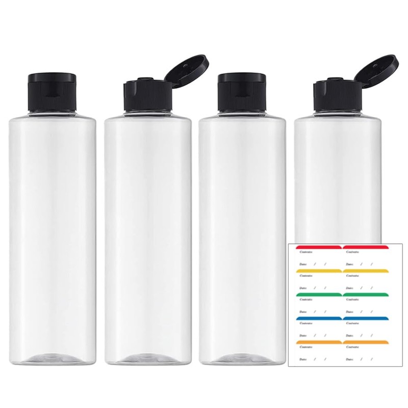 - Practical travel set: you will receive 4 pieces 250 ml travel bottles with flip top closure and 1 label for easy differentiation of contents. Perfect as refill bottles for shampoo, lotion or shower gel - ideal for travel or everyday use!