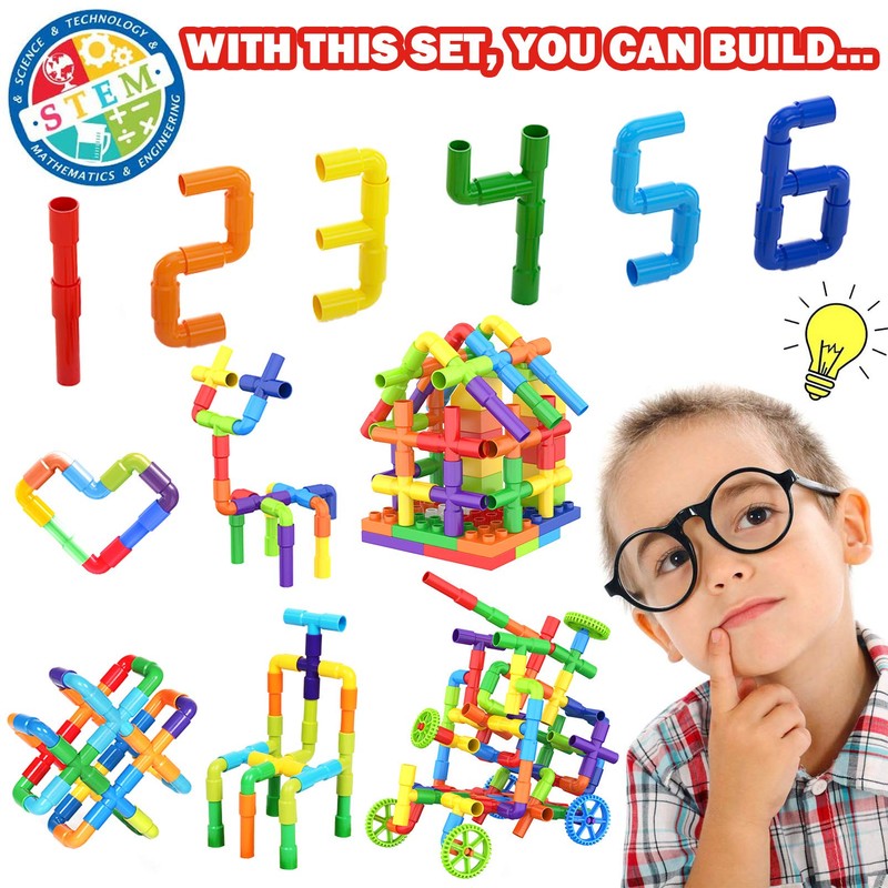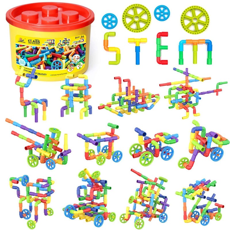 - FUN & SIMPLE CONCEPT BUILDING BLOCKS: Our 250 pieces tube building toys use a simple pipe splicing concept that can DIY create more than 200 figures or animals or car models, so that young children can enjoy more construction fun. This set of STEM toys is more perfect for children aged 3-4-5. Different shapes and colorful tube parts help your kids learn colors. Durable plastic interlocking toys ideal for building structure, animals, aircraft, cars, shapes, robots, and more children can imagine.