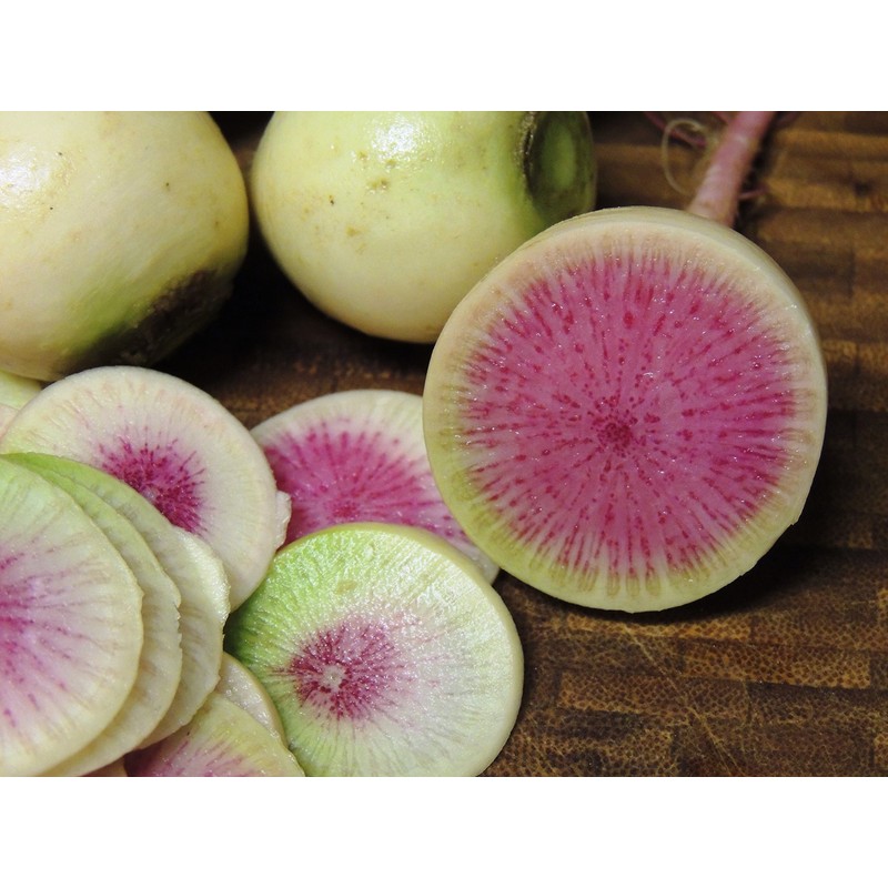 - Also known as "Chinese Red Meat". This heirloom variety has white skin, green shoulders, and a pink interior. Grows to 4" in diameter and has a sweet taste. Looks GREAT in salads and is delicious when eaten raw. 25-55 Days, open-pollinated heirloom variety