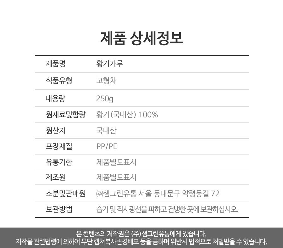 - manufacture_date, expiration_date_or_quality_maintenance_period: Manufacture date: Shipped with more than 6 months remaining from the order date / Expiration date: Up to 24 months from the manufacturing date, shipped with more than 6 months remaining from the order date / For detailed expiration date inquiries, please contact Samgreen Herbal Mall Customer Center at 02-966-2476 / Expiration date: Up to 24 months from the manufacturing date.