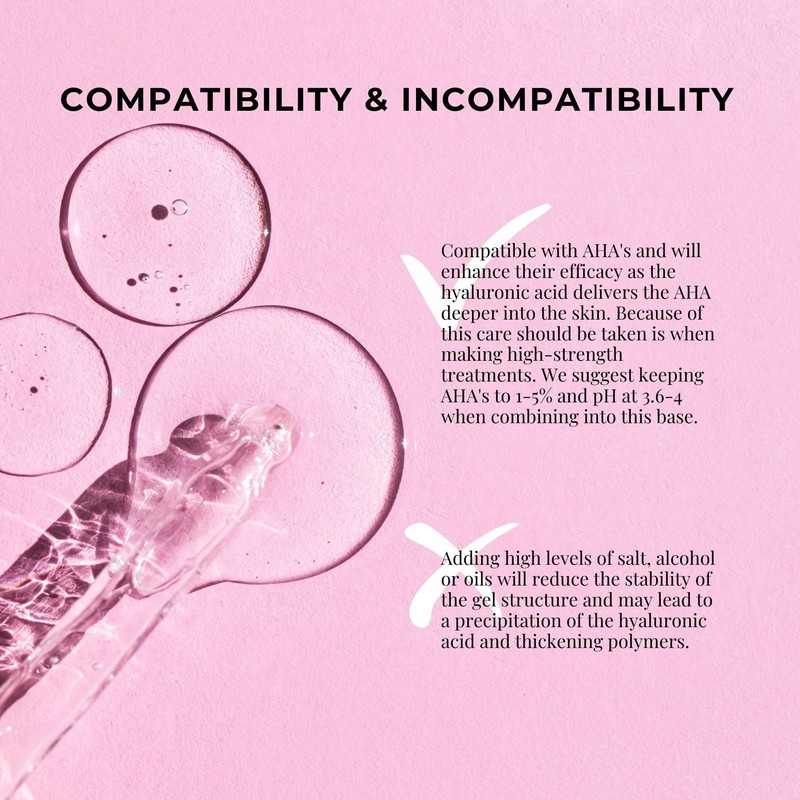 - Compatible with AHA's and will enhance their efficacy as the hyaluronic acid delivers the AHA deeper into the skin. Because of this care should be taken is when making high-strength treatments. We suggest keeping AHA's to 1-5% and pH at 3.6-4 when combining into this base.