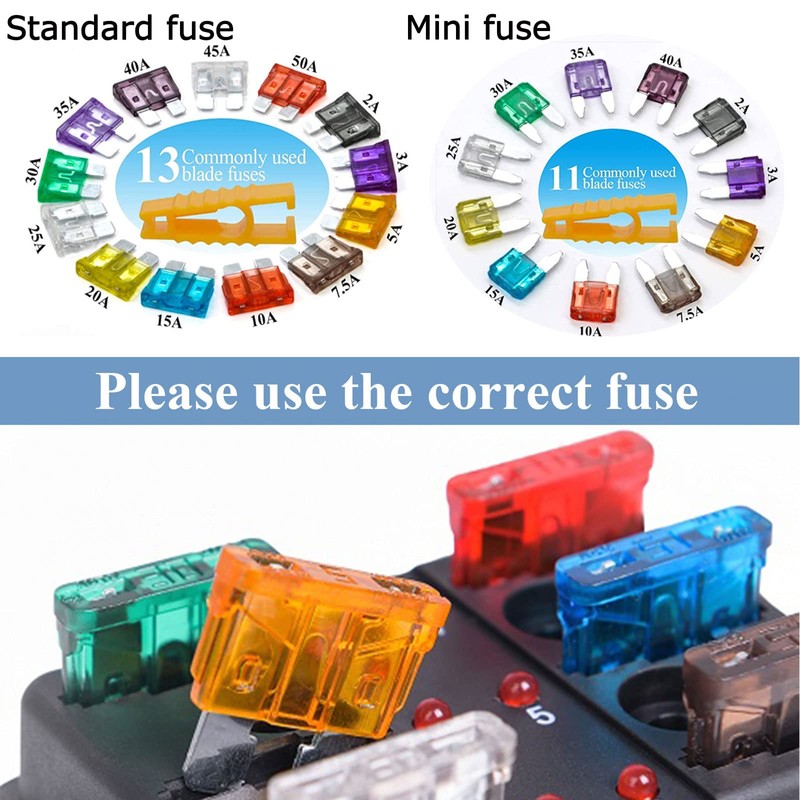 - The color on each box represents the amperage of the fuse, please read the text on the box carefully before buying.