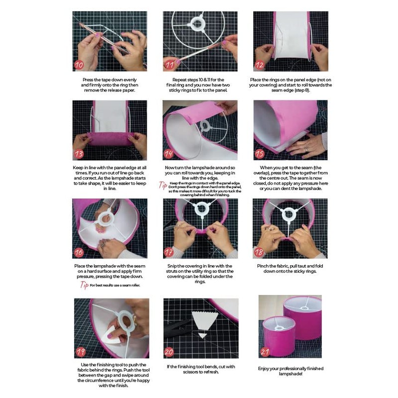- EASY TO USE & WITH SIMPLE STEP INSTRUCTIONS: Create a beautiful shade in less time than it takes to go to the shop. Cut your fabric or wallpaper to size and peel the self-adhesive lampshade panel onto the fabric. Then with the strong self-adhesive tape, tack the wire and panel together. Use the tucking tool to fold excess fabric under to complete your lampshade. Simple step by step instructions with pictures are included in the packaging but you can also check out our tutorial videos.