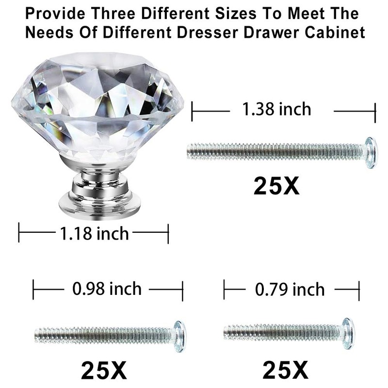 • 25 pack cabinet drawer knobs are easy to install for adult. Cabinet door knobs includes three sizes of screws prepared for different cabinets.0.79 inch x 25pcs, 0.98 inch x 25pcs, 1.38 inch x 25pcs.