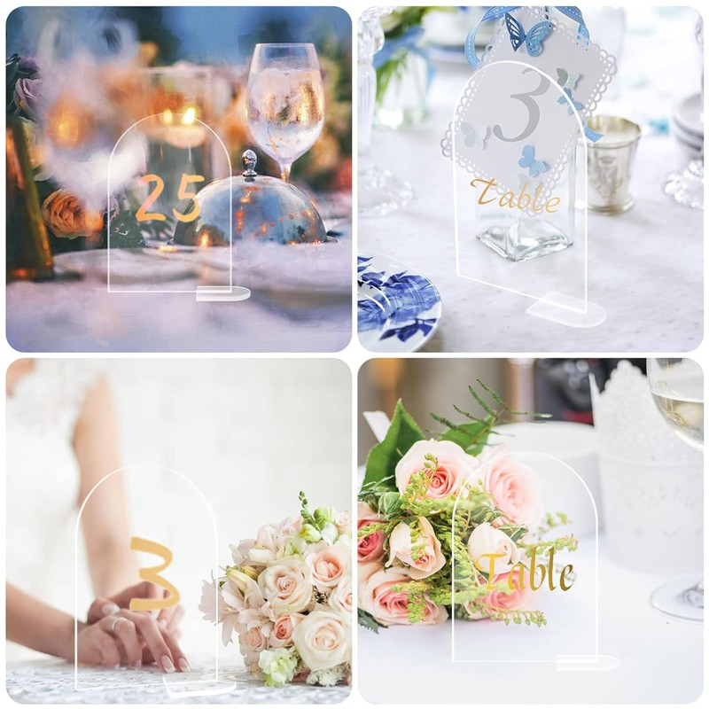 - 【Modern and Simple Design】: Add a touch of style to your wedding with our modern arched acrylic table number signs. Their sleek edges and clean lines make them perfect for tabletop centerpieces.